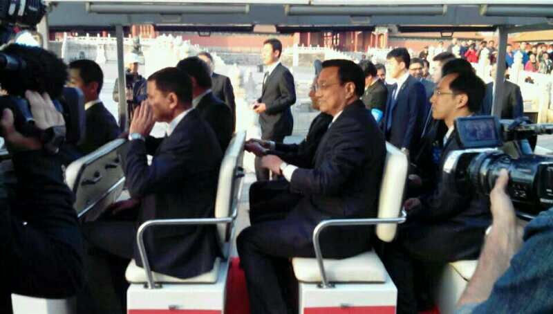 中國總理李克強陪同印度總理莫迪乘坐瑪西爾觀光車游覽參觀故宮